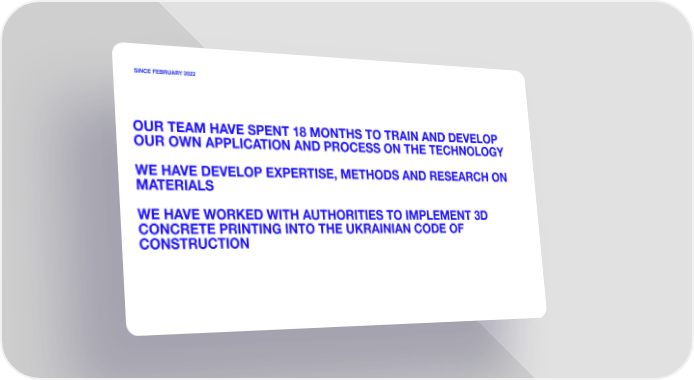 SINCE FEBRUARY 2022 OUR TEAM HAVE SPENT 18 MONTHS TO TRAIN AND DEVELOP OUR OWN APPLICATION AND PROCESS ON THE TECHNOLOGY WE HAVE DEVELOP EXPERTISE, METHODS AND RESEARCH ON MATERIALS WE HAVE WORKED WITH AUTHORITIES TO IMPLEMENT 3D CONCRETE PRINTING INTO THE UKRAINIAN CODE OF CONSTRUCTION