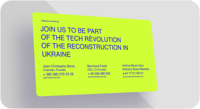 CREATE A HIT WITH US JOIN US TO BE PART OF THE TECH RÉVOLUTION OF THE RECONSTRUCTION IN UKRAINE Jean-Christophe Bonis Bernhard Friedl Joshua Bauer-Saul Chairman, Founder CEO, Co-Founder Advisory Board Member +380 (68) 276 33 28 +48 538 488 933 +44 7714 749131 jean@team4ua.org bernhard@team4ua.org joshua.bowersaul@gmail.com