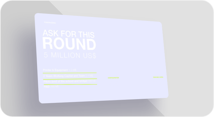FUNDRAISING ASK FOR THIS ROUND 5 MILLION US$ Printer & Equipment 1.5 M$ 2 Years Working Capital and Team 2.4 M$ Pilots (end of the school and bridge) 850 k$ CONFIGURATION PRINTABLE AREA Width (X) 14.6m Floor count - 3 floors R&D 250 k$ Length (Y) 34.8m Floor area - 501 m2 Height (Z) 8.5 m Total Area - 1503 m2