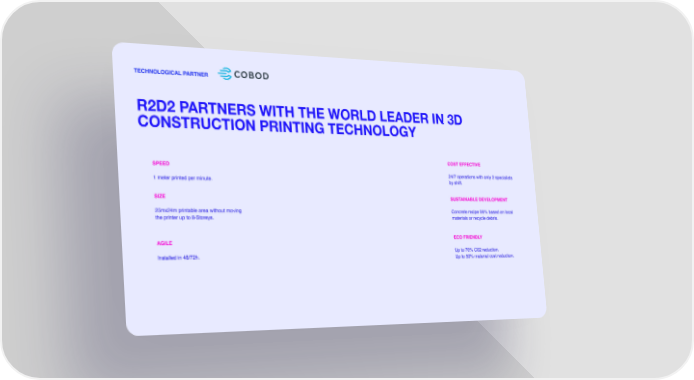 TECHNOLOGICAL PARTNER R2D2 PARTNERS WITH THE WORLD LEADER IN 3D CONSTRUCTION PRINTING TECHNOLOGY COST EFFECTIVE SPEED 24/7 operations with only 2 specialists 1 meter printed per minute. by shift. SIZE SUSTAINABLE DEVELOPMENT 25mx24m printable area without moving Concrete recipe 99% based on local the printer up to 8-Storeys. materials or recycle debris. AGILE ECO FRIENDLY Installed in 48/72h. Up to 70% C02 reduction. Up to 50% material cost reduction.