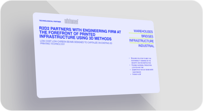 TECHNOLOGICAL PARTNER R2D2 PARTNERS WITH ENGINEERING FIRM AT WAREHOUSES THE FOREFRONT OF PRINTED BRIDGES INFRASTRUCTURE USING 3D METHODS INFRASTRUCTURE LOW-COST LOW-CARBON BEAMS DESIGNED TO CAPITALIZE ON EXISTING 3D INDUSTRIAL PRINTING TECHNOLOGY • SCALABLE SOLUTION TO MEET THE SUSTAINABILITY DEMANDS ON THE INDUSTRY AND RECONSTRUCTION • FLEXIBLE IN DESIGN, PRODUCTION, LOCATION AND TIME • COMPETITIVE FOR ANY BEAMS MORE THAN 6 METER • PATENT IN UK