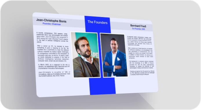 Jean-Christophe Bonis The Founders Bernhard Friedl Founder, Chairman Co-Founder, CEO A futurist, entrepreneur, TED speaker, writer, A pragmatic realist, entrepreneur, investor, vivid passionate about new technologies and tireless traveler and polyglot, Bernhard has co-founded globe-trotter, Jean-Christophe was recognized in several companies in Europe and North America. 2019 among the most influential French experts As a native German he brings basic business in the field of artificial intelligence across the knowledge and decade long hands on planet. experience to the table. After a career as VC, he decided to leave After a career as a C-level executive, he decided everything to give a meaning to his life. He to re-focus on passing on his knowledge to the travelled the 5 continents to meet the different next generations of entrepreneurs and has cultures impacted by today’s digital challenges. engage as a mentor and investor in the market. An entrepreneur committed to the ecosystem of In addition to these functions, he serves as a successful start-ups, he led for 10 years a start- supervisory board member of stock listed up studio dedicated to projects in the field of companies. artificial intelligence (anomaly detection, computer vision, smart city and industry 4.0). His background in computer science combined with the knowledge of an MBA in Finance In March 2022, as a response to the war in provided him with the deep understanding Ukraine, he established NGO Team4UA and HIT necessary to assess the potential of new (Humanitarian Innovative Technologies). technologies in todays and tomorrow’s markets. Jean-Christophe is co-author of “24h of Growing companies from the ground up, (Startup innovations, wake up it’s already tomorrow”, from to IPO), Bernhard is familiar with the challenges the DUNOD editions, Nov 2018, France. a company faces through its lifecycle.