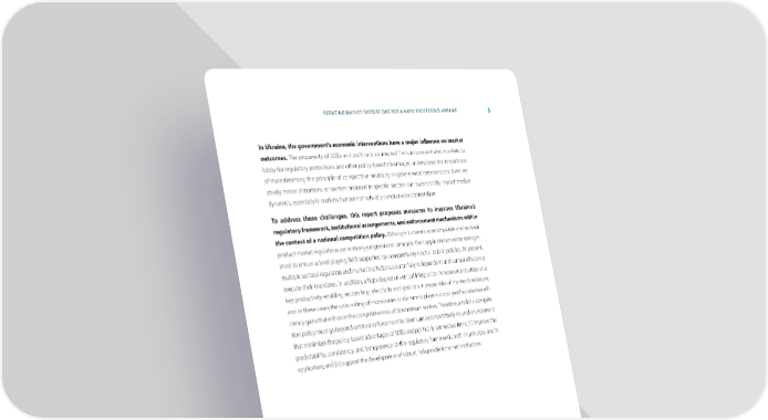 REDUCING MARKET DISTORTIONS FOR A MORE PROSPEROUS UKRAINE 3 in Ukraine, the government’s economic interventions have a major in昀氀uence on market outcomes. The propensity of SOEs and politically connected 昀椀rms in concentrated markets to lobby for regulatory protections and other policy-based advantages underscores the importance of mainstreaming the principle of competitive neutrality in government interventions. Even rel- atively minor distortions or barriers imposed in speci昀椀c sectors can substantially impact market dynamics, especially in markets that are not naturally conducive to contestation. To address these challenges, this report proposes measures to improve Ukraine’s regulatory framework, institutional arrangements, and enforcement mechanisms within the context of a national competition policy. Although Ukraine’s economywide and sectoral product-market regulations are relatively progressive in principle, their application must be strength- ened to ensure a level playing 昀椀eld supported by competitively neutral public policies. At present, multiple sectoral regulators and market institutions are not fully independent and cannot e昀昀ectively execute their mandates. In addition, a high degree of vertical integration in network industries and key productivity-enabling sectors (e.g., electricity and gas) can increase risks of market foreclosure, and in these cases the unbundling of monopolies or dominant players could yield substantial e昀케- ciency gains that enhance the competitiveness of downstream sectors. Therefore, a holistic competi- tion policy must go beyond antitrust enforcement to: (i) ensure a competitively neutral environment that minimizes the policy-based advantages of SOEs and politically connected 昀椀rms; (ii) improve the predictability, consistency, and transparency of the regulatory framework, both in principle and in application; and (iii) support the development of robust, independent market institutions.