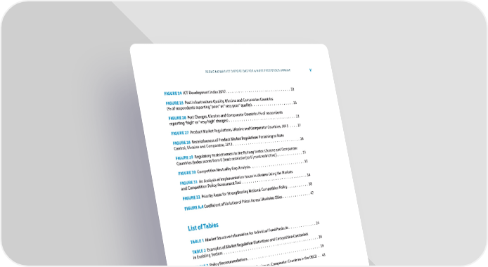 REDUCING MARKET DISTORTIONS FOR A MORE PROSPEROUS UKRAINE V FIGURE 24 ICT Development Index 2017 ⸀ ⸀ ⸀ ⸀ ⸀ ⸀ ⸀ ⸀ ⸀ ⸀ ⸀ ⸀ ⸀ ⸀ ⸀ ⸀ ⸀ ⸀ ⸀ ⸀ ⸀ ⸀ ⸀ ⸀ ⸀ ⸀ ⸀ ⸀ ⸀ ⸀ ⸀ ⸀ 22 FIGURE 25 Port Infrastructure Quality, Ukraine and Comparator Countries (% of respondents reporting “poor” or “very poor” quality) ⸀ ⸀ ⸀ ⸀ ⸀ ⸀ ⸀ ⸀ ⸀ ⸀ ⸀ ⸀ ⸀ ⸀ ⸀ ⸀ ⸀ ⸀ ⸀ ⸀ ⸀ 23 FIGURE 26 Port Charges, Ukraine and Comparator Countries (% of respondents reporting “high” or “very high” charges) ⸀ ⸀ ⸀ ⸀ ⸀ ⸀ ⸀ ⸀ ⸀ ⸀ ⸀ ⸀ ⸀ ⸀ ⸀ ⸀ ⸀ ⸀ ⸀ ⸀ ⸀ ⸀ ⸀ ⸀ ⸀ ⸀ ⸀ ⸀ ⸀ ⸀ ⸀ ⸀ ⸀ 23 FIGURE 27 Product Market Regulations, Ukraine and Comparator Countries, 2013 ⸀ ⸀ ⸀ ⸀ 27 FIGURE 28 Restrictiveness of Product Market Regulations Pertaining to State Control, Ukraine and Comparator, 2013 ⸀ ⸀ ⸀ ⸀ ⸀ ⸀ ⸀ ⸀ ⸀ ⸀ ⸀ ⸀ ⸀ ⸀ ⸀ ⸀ ⸀ ⸀ ⸀ ⸀ ⸀ ⸀ ⸀ ⸀ ⸀ ⸀ ⸀ ⸀ ⸀ ⸀ ⸀ ⸀ ⸀ 28 FIGURE 29 Regulatory Restrictiveness in the Railway Sector, Ukraine and Comparator Countries (index scores from 0 [least restrictive]to 6 [most restrictive]) ⸀ ⸀ ⸀ ⸀ ⸀ ⸀ ⸀ ⸀ ⸀ ⸀ ⸀ ⸀ ⸀ 31 FIGURE 30 Competitive Neutrality Gap Analysis ⸀ ⸀ ⸀ ⸀ ⸀ ⸀ ⸀ ⸀ ⸀ ⸀ ⸀ ⸀ ⸀ ⸀ ⸀ ⸀ ⸀ ⸀ ⸀ ⸀ ⸀ ⸀ ⸀ ⸀ ⸀ ⸀ ⸀ 33 FIGURE 31 An Analysis of Implementation Issues in Ukraine Using the Markets and Competition Policy Assessment Tool ⸀ ⸀ ⸀ ⸀ ⸀ ⸀ ⸀ ⸀ ⸀ ⸀ ⸀ ⸀ ⸀ ⸀ ⸀ ⸀ ⸀ ⸀ ⸀ ⸀ ⸀ ⸀ ⸀ ⸀ ⸀ ⸀ ⸀ ⸀ ⸀ ⸀ ⸀ ⸀ 34 FIGURE 32 Priority Areas for Strengthening National Competition Policy ⸀ ⸀ ⸀ ⸀ ⸀ ⸀ ⸀ ⸀ ⸀ ⸀ ⸀38 FIGURE A.4 Coe昀케cient of Variation of Prices Across Ukrainian Cities ⸀ ⸀ ⸀ ⸀ ⸀ ⸀ ⸀ ⸀ ⸀ ⸀ ⸀ ⸀ ⸀ ⸀ 47 List of Tables TABLE 1 Market Structure Information for Individual Food Products ⸀ ⸀ ⸀ ⸀ ⸀ ⸀ ⸀ ⸀ ⸀ ⸀ ⸀ ⸀ ⸀ ⸀ 25 TABLE 2 Examples of Market Regulation Distortions and Competition Constraints in Enabling Sectors ⸀ ⸀ ⸀ ⸀ ⸀ ⸀ ⸀ ⸀ ⸀ ⸀ ⸀ ⸀ ⸀ ⸀ ⸀ ⸀ ⸀ ⸀ ⸀ ⸀ ⸀ ⸀ ⸀ ⸀ ⸀ ⸀ ⸀ ⸀ ⸀ ⸀ ⸀ ⸀ ⸀ ⸀ ⸀ ⸀ ⸀ ⸀ ⸀ ⸀ ⸀ ⸀ ⸀ ⸀ ⸀ ⸀ 30 TABLE 3 Policy Recommendations ⸀ ⸀ ⸀ ⸀ ⸀ ⸀ ⸀ ⸀ ⸀ ⸀ ⸀ ⸀ ⸀ ⸀ ⸀ ⸀ ⸀ ⸀ ⸀ ⸀ ⸀ ⸀ ⸀ ⸀ ⸀ ⸀ ⸀ ⸀ ⸀ ⸀ ⸀ ⸀ ⸀ ⸀ ⸀ ⸀ 39 TABLE A.1 Price Comparison Analysis: Ukraine vs ⸀ Comparator Countries in the OECD ⸀ ⸀ 43 TABLE A.2 Price Comparison Analysis: Kiev, Ukraine vs ⸀ Comparator Cities in OECD and Selected ECA Countries ⸀ ⸀ ⸀ ⸀ ⸀ ⸀ ⸀ ⸀ ⸀ ⸀ ⸀ ⸀ ⸀ ⸀ ⸀ ⸀ ⸀ ⸀ ⸀ ⸀ ⸀ ⸀ ⸀ ⸀ ⸀ ⸀ ⸀ ⸀ ⸀ ⸀ ⸀ ⸀ ⸀ ⸀ ⸀ ⸀ 45 TABLE A.3 Price Comparisons Analysis: Ukraine vs ⸀ OECD and Selected ECA Countries ⸀ ⸀ 46 TABLE B.1 Price Comparison Analysis: Ukraine vs ⸀ Comparator Countries in the OECD and Selected ECA Countries ⸀ ⸀ ⸀ ⸀ ⸀ ⸀ ⸀ ⸀ ⸀ ⸀ ⸀ ⸀ ⸀ ⸀ ⸀ ⸀ ⸀ ⸀ ⸀ ⸀ ⸀ ⸀ ⸀ ⸀ ⸀ ⸀ ⸀ ⸀ ⸀ ⸀ ⸀ ⸀ ⸀ ⸀ ⸀ ⸀ ⸀ ⸀ ⸀ ⸀ ⸀ 43 TABLE B.2 Price Comparison Analysis: Dnipropetrovsk, Kharkiv, Kiev, Lviv, Odesa, and Sumy in Ukraine vs ⸀ Comparator Cities in OECD and Selected ECA Countries ⸀ ⸀ ⸀ ⸀ ⸀ ⸀ 45 TABLE C.1 Price Comparison Analysis: Ukraine vs ⸀ Comparator Countries in the OECD ⸀ ⸀ 44 TABLE C.2 Price Comparison Analysis within Ukrainian Provinces ⸀ ⸀ ⸀ ⸀ ⸀ ⸀ ⸀ ⸀ ⸀ ⸀ ⸀ ⸀ ⸀ ⸀ ⸀ ⸀ 46 TABLE D.1 Price Comparison Analysis: Ukraine vs ⸀ Comparator Countries in the OECD and Selected ECA Countries ⸀ ⸀ ⸀ ⸀ ⸀ ⸀ ⸀ ⸀ ⸀ ⸀ ⸀ ⸀ ⸀ ⸀ ⸀ ⸀ ⸀ ⸀ ⸀ ⸀ ⸀ ⸀ ⸀ ⸀ ⸀ ⸀ ⸀ ⸀ ⸀ ⸀ ⸀ ⸀ ⸀ ⸀ ⸀ ⸀ 44