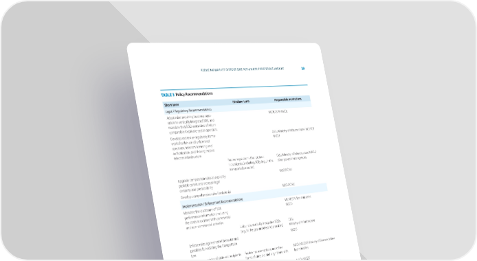 REDUCING MARKET DISTORTIONS FOR A MORE PROSPEROUS UKRAINE 39 TABLE 3 Policy Recommendations Short term Medium term Responsible institutions Legal / Regulatory Recommendations Adopt rules requiring business sepa- MEDT/ SPF/AMCU ration in vertically integrated SOE, and mandate that SOEs earn rates of return comparable to private-sector operators Develop and revise regulatory frame- CMU/Ministry of Infrastructure / NCSRCI/ works for the use of unlicensed AMCU spectrum, telecom licensing and authorization, and sharing mobile- telecom infrastructure Revise regulations that protect CMU/Ministry of Infrastructure/AMCU/ incumbents, including SOEs (e.g., in the other government agencies transportation sector) Upgrade competition rules to explicitly AMCU/CMU prohibit cartels and increase legal certainty and predictability Develop comprehensive rules for state aid AMCU/CMU Implementation / Enforcement Recommendations Mandate the disclosure of SOE MEDT/SPF/line ministries performance information, including AMCU the costs associated with commercial and non-commercial activities Unbundle vertically integrated SOEs CMU (e.g., in the gas and electricity sectors) Ministry of Infrastructure Enforce rules against cartel behavior and AMCU penalties for violating the Competition Law Develop a registry of state-aid recipients Review tax exemptions and other AMCU/MEDT/ Ministry of Finance /other forms of state aid and align them with line ministries regulations Prioritize pro-competition public AMCU/MEDT procurement processes Institutional Recommendations Ensure the independence of sectoral CMU/Ministry of Infrastructure/other regulators to avoid con昀氀icts of interest government agencies between policy objectives and SOE incentives (e.g., in the transportation and telecom sectors) Strengthen the AMCU’s institutional CMU/AMCU guarantees and provide it with the necessary resources to ful昀椀ll its mandate
