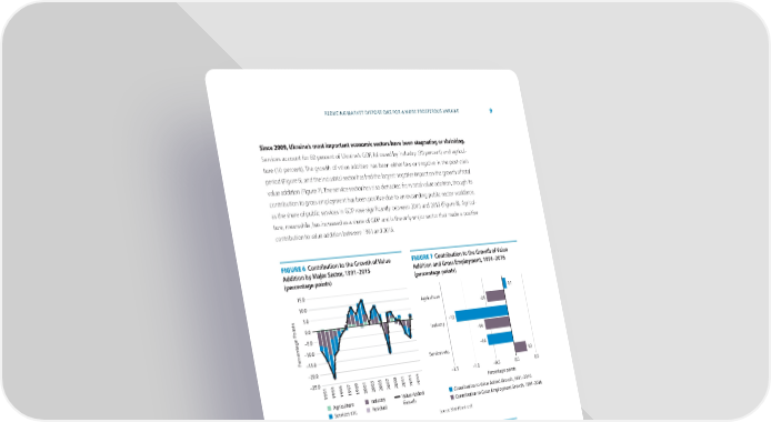 REDUCING MARKET DISTORTIONS FOR A MORE PROSPEROUS UKRAINE 9 Since 2009, Ukraine’s most important economic sectors have been stagnating or shrinking. Services account for 60 percent of Ukraine’s GDP, followed by industry (30 percent) and agricul- ture (10 percent). The growth of value addition has been either low or negative in the post-crisis period (Figure 6), and the industrial sector has had the largest negative impact on the growth of total value addition (Figure 7). The service sector has also detracted from total value addition, though its contribution to gross employment has been positive due to an expanding public-sector workforce, as the share of public services in GDP rose signi昀椀cantly between 2010 and 2015 (Figure 8). Agricul- ture, meanwhile, has increased as a share of GDP and is the only major sector that made a positive contribution to value addition between 1991 and 2016. FIGURE 6 Contribution to the Growth of Value FIGURE 7 Contribution to the Growth of Value Addition by Major Sector, 1991–2015 Addition and Gross Employment, 1991–2016 (percentage points) (percentage points) 15.0 10.0 0.1 Agriculture 5.0 –0.4 0.0 –1.3 –5.0 Industry –0.6 –10.0 Percentage Points–15.0 –0.6 –20.0 Services etc. 0.3 –25.0 1 3 5 7 9 1 3 5 7 9 1 3 5 –1.5 –1.0 –0.5 0.0 0.5 9 9 9 9 9 0 0 0 0 0 1 1 1 9 9 9 9 9 0 0 0 0 0 0 0 0 1 1 1 1 1 2 2 2 2 2 2 2 2 Percentage points Agriculture Industry Value Added Contribution to Value Added Growth, 1991–2016 Services etc. Residual Growth Contribution to Gross Employment Growth, 1991–2016 Source: World Bank sta昀昀 Source: World Bank sta昀昀 FIGURE 8 Supply-Side GDP Decomposition by Subsector, 2010 and 2015 (%) 100% 21.6% 24.1% 80% Administrative, public and other services Transport and logistics 60% FIRE (nance, insurance, real estate) 11.9% 11.2% Retail trade, catering and hotels 40% Construction Manufacturing 33.3% 28.7% Mining and quarrying 20% Agriculture, forestry and shing 0% 2010 2015 Source: Ukrstat.