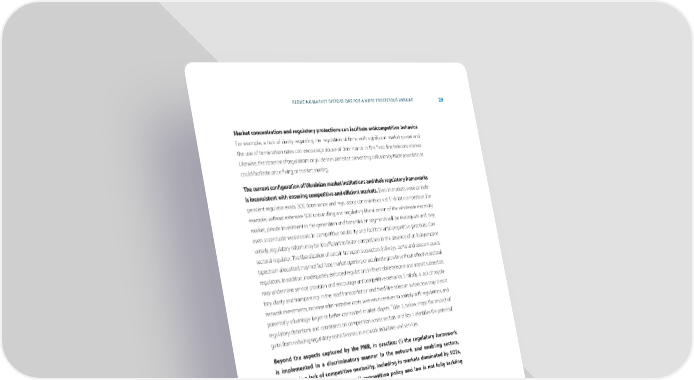REDUCING MARKET DISTORTIONS FOR A MORE PROSPEROUS UKRAINE 29 Market concentration and regulatory protections can facilitate anticompetitive behavior. For example, a lack of clarity regarding the regulation of 昀椀rms with signi昀椀cant market power and the use of termination rates can encourage abuse of dominance in the 昀椀xed-line telecom market. Likewise, the absence of regulations or guidelines aimed at preventing collusion by trade associations could facilitate price 昀椀xing or market sharing. The current con昀椀guration of Ukrainian market institutions and their regulatory frameworks is inconsistent with ensuring competitive and e昀케cient markets. Even in markets were an inde- pendent regulator exists, SOE dominance and regulatory constraints can still inhibit competition. For example, without extensive SOE unbundling and regulatory liberalization of the wholesale electricity market, private investment in the generation and transmission segments will be inadequate and may even accentuate weaknesses in competitive neutrality and facilitate anticompetitive practices. Con- versely, regulatory reform may be insu昀케cient to foster competition in the absence of an independent sectoral regulator. The liberalization of certain transport subsectors (railways, ports) and telecom assets (spectrum allocation) may not facilitate market opening or accelerate growth without e昀昀ective sectoral regulators. In addition, inadequately enforced regulations in the mobile telecom and airport subsectors may undermine service provision and encourage anticompetitive behavior. Similarly, a lack of regula- tory clarity and transparency in the road transportation and 昀椀xed-line telecom subsectors may distort network investments, increase administrative costs, weaken incentives to comply with regulations, and potentially advantage larger or better-connected market players. Table 2, below, maps the impact of regulatory distortions and constraints on competition across sectors, and Box 1 identi昀椀es the potential gains from reducing regulatory restrictiveness in network industries and services. Beyond the aspects captured by the PMR, in practice: (i) the regulatory framework is implemented in a discriminatory manner in the network and enabling sectors, (ii) there is a lack of competitive neutrality, including in markets dominated by SOEs, and (iii) enforcement of the overall competition policy and law is not fully tackling anti competitive behavior. Unclear regulations and uneven or discriminatory enforcement increase administra- tive costs, weaken compliance incentives, and tend to bene昀椀t large 昀椀rms and incum- bents. Ukraine scores 5.8 out of 10 on the Bertelsmann Stiftung Transformation Index for market organization, lagging behind the average for comparator countries. The index measures the perception that clear rules are in place to guide stable, market-based competition. Moreover, numerous instances of discrimination have occurred regardless of the regulatory framework. For example, Ukraine International Airlines has historically received preferential rates for passenger transfers, aircraft service, and parking space at the country’s largest airport, the state-run Kiev Boryspil, as well as preferred parking space for aircraft and prime real estate in the airport termi- nals. In some market segments, such as airline baggage-handling services, the regulatory frame- work is limited, and enforcement is wholly inadequate.