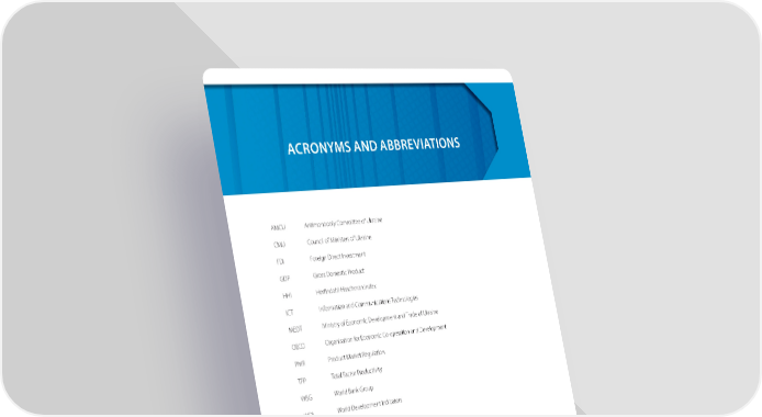 ACRONYMS AND ABBREVIATIONS AMCU Antimonopoly Committee of Ukraine CMU Council of Ministers of Ukraine FDI Foreign Direct Investment GDP Gross Domestic Product HHI Her昀椀ndahl-Hirschman Index ICT Information and Communications Technologies MEDT Ministry of Economic Development and Trade of Ukraine OECD Organisation for Economic Co-operation and Development PMR Product Market Regulation TFP Total Factor Productivity WBG World Bank Group WDI World Development Indicators i