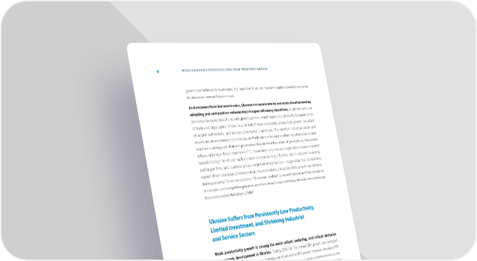 6 REDUCING MARKET DISTORTIONS FOR A MORE PROSPEROUS UKRAINE government interventions are especially important in sectors that are naturally vulnerable to market failures or anticompetitive practices. As it recovers from the recent crisis, Ukraine can accelerate its economic development by adopting pro-competition reforms that sharpen e昀케ciency incentives. In past decades, the economy has experienced a volatile growth pattern, which expansions driven by favorable terms of trade and large capital in昀氀ows in a context of weak underlying productivity growth, persistent structural bottlenecks, and serious governance challenges. The country’s industrial sector and export structure are resistant to change, and both remain focused on older industries such as steel, machine-building, and chemical production despite their low levels of productivity. Meanwhile, in昀氀ows of foreign direct investment (FDI) have been very modest, especially in export-oriented manufacturing.6 Small and medium-sized enterprises play a limited role in Ukraine’s economy, and larger firms and business groups dominate most sectors—suggesting that competitive, market-driven processes of entrepreneurship, innovation, and productivity growth are not func- 7 tioning properly. Firms’ perceptions of the power wielded by vested interests and the prevalence of cronyism, anticompetitive practices, and discrimination against foreign 昀椀rms further underscore 8 the country’s distorted playing 昀椀eld. Ukraine Su昀昀ers from Persistently Low Productivity, Limited investment, and Shrinking industrial and Service Sectors Weak productivity growth is among the most salient, enduring, and critical obstacles to economic development in Ukraine. During 2000–08, the annual TFP growth rate averaged 6.6 percent, and rising TFP was responsible for over 80 percent of GDP growth. However, the robust TFP growth observed during this period was due in part to rebounding capacity utilization following the sharp post-transition contraction of the 1990s. During the 2008–09 global 昀椀nancial crisis, deteriorating external conditions caused TFP to plummet, and between 2010 and 2016 the annual TFP growth rate averaged just 0.9 percent (Figure 1), well below the rates of most comparable countries in Eastern Europe 9 and Central Asia (Figure 2). Low TFP growth rates have detracted from overall GDP growth in recent years (Figure 3). While signs of a recovery in TFP growth have emerged since 2016, restoring productivity growth to pre-crisis levels and sustaining those levels over time pose considerable challenges. 6 FDI represented 1 % of GDP in January-July 2017. World Bank. 2017. Macro Poverty Outlook for Europe and Central Asia and World Development Indicators. 7 World Bank (2014). Opportunities and Challenges for Private Sector Development. 8 Economist Intelligence Unit (2018). 9 Poland, Turkey, Lithuania, Romania, Moldova, Kazakhstan, Bulgaria, Estonia, Latvia, Croatia, Czech Republic, Georgia.